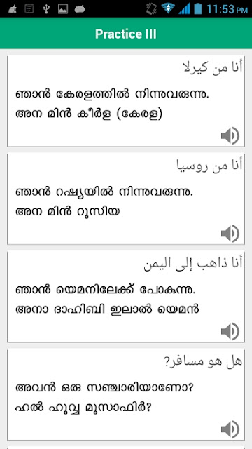 അറബിക് ഓഡിയോയും ഇതിൽ ലഭ്യമാണ്. മലയാളം ശൈലികളും ഉപയോഗിച്ച് മലയാളം സംസാരിക്കുന്നവരെ അറബി പഠിക്കാൻ സഹായിക്കുന്നതിനാണ് ഇത് രൂപകൽപ്പന ചെയ്തിരിക്കുന്നത്. ഈ ആപ്ലിക്കേഷൻ ഉപയോഗിച്ച് പഠനം വളരെ ലളിതമാണ്, അറബി പദങ്ങളുടെ ഉച്ചാരണം കേൾക്കാൻ ഉപയോക്താക്കൾക്ക് സ്പീക്കർ ഐക്കണിൽ ടാപ്പുചെയ്യാനാകും. അറബിക് മലയാളത്തിലേക്ക് വിവർത്തനം ചെയ്യുന്നതിനുള്ള മുൻനിർവചിക്കപ്പെട്ട ഘടനയാണ് ആപ്പ് പിന്തുടരുന്നത്.