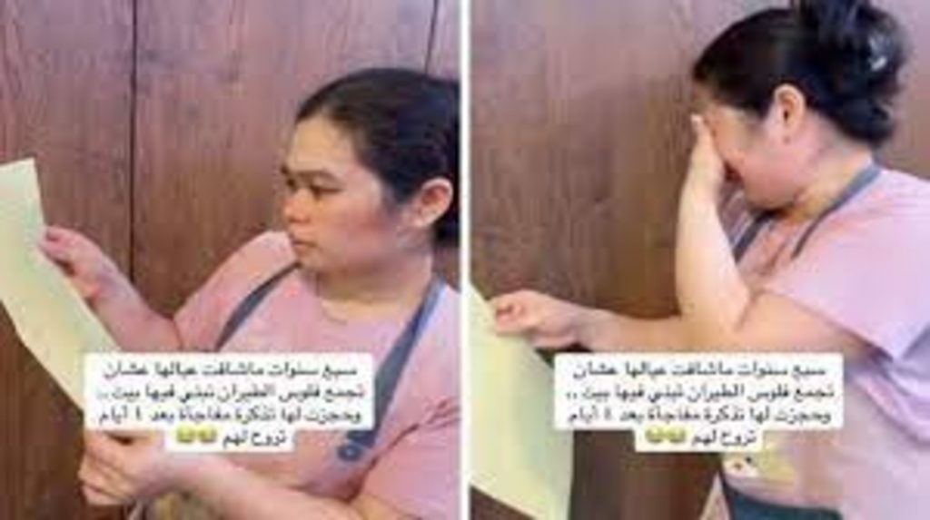 സൗദിയിലെത്തി ഏഴ് വർഷത്തിനു ശേഷം നാട്ടിൽ പോകാനായി തൻ്റെ സ്പോൺസർ സ്വന്തം ചെലവിൽ ടിക്കറ്റെടുത്ത് നൽകിയപ്പോൾ ഒരു ഫിലിപൈനി വേലക്കാരിയുടെ പ്രതികരണം സോഷ്യൽ മീഡിയയിൽ വൈറലാകുന്നു.നാട്ടിലെ തൻ്റെ വീട് പണി പൂർത്തിയാക്കാൻ വേണ്ടി, സ്പോൺസർ നിർബന്ധമായും നൽകേണ്ട ടിക്കറ്റ് സ്വീകരിക്കാതെ പകരം ടിക്കറ്റ് മണി സ്വീകരിച്ച് നാട്ടിലേക്കയക്കുകയായിരുന്നു വേലക്കാരി ചെയ്തിരുന്നത്. അതായിരുന്നു ഇത്രയും കാലം അവരുടെ നാട്ടിലേക്കുള്ള പോക്ക് വൈകാൻ കാരണമായതും.എന്നാൽ തൻ്റെ മക്കളെ പിരിഞ്ഞ് കഴിഞ്ഞ ഏഴ് വർഷമായി തങ്ങളുടെ കൂടെ കഴിയുന്ന വേലക്കാരിക്ക് ഒടുവിൽ സ്പോൺസർ തൻ്റെ ചിലവിൽ തന്നെ ടിക്കറ്റെടുത്ത് നൽകുകയായിരുന്നു.സ്പോൺസർ അവരുടെ വകയായി തനിക്ക് ടിക്കറ്റെടുത്ത് നൽകിയത് കണ്ടപ്പോൾ വേലക്കാരി സന്തോഷം കൊണ്ട് പൊട്ടിക്കരയുകയും സ്പോൺസറുടെ കുട്ടികളെ ചേർത്ത് പിടിച്ച് വിതുംബുകയുമായിരുന്നു. വീഡിയോ കാാണാം.