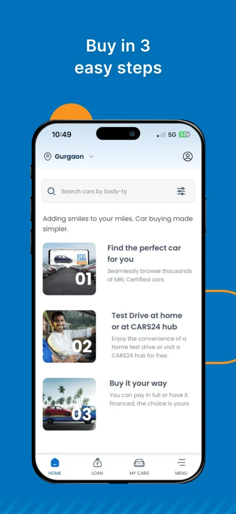പ്രീ-ഓൺഡ് കാറുകൾക്കായുള്ള അഡ്വാൻസ്ഡ് മൊബൈൽ ആപ്ലിക്കേഷനാണിത്. വെറും ഒരു മണിക്കൂറിനുള്ളിൽ വിൽപ്പനക്കാർക്ക് അവരുടെ വാഹനങ്ങളുടെ മികച്ച വിലയാണ് ലഭിക്കുന്നത്. സർട്ടിഫൈഡ് കാറുകൾ ഒരൊറ്റ ക്ലിക്കിലൂടെ cars24 app ഹോം ഡെലിവറി ചെയ്യുന്നതിലൂടെ കാർ വാങ്ങുന്നവർക്ക് മികച്ച അനുഭവമാണ് ലഭിക്കുക.