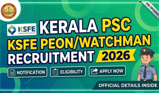 കേരള സ്റ്റേറ്റ് ഫിനാൻഷ്യൽ എൻ്റർപ്രൈസസ് ലിമിറ്റഡിൽ (KSFE Limited) പ്യൂൺ/വാച്ച്മാൻ (Peon/Watchman) തസ്തികയിലേക്ക് കേരള പബ്ലിക് സർവ്വീസ് കമ്മീഷൻ പുതിയ വിജ്ഞാപനം പുറത്തിറക്കി. കാറ്റഗറി നമ്പർ 05/2026 മുതൽ 12/2026 വരെയുള്ള…